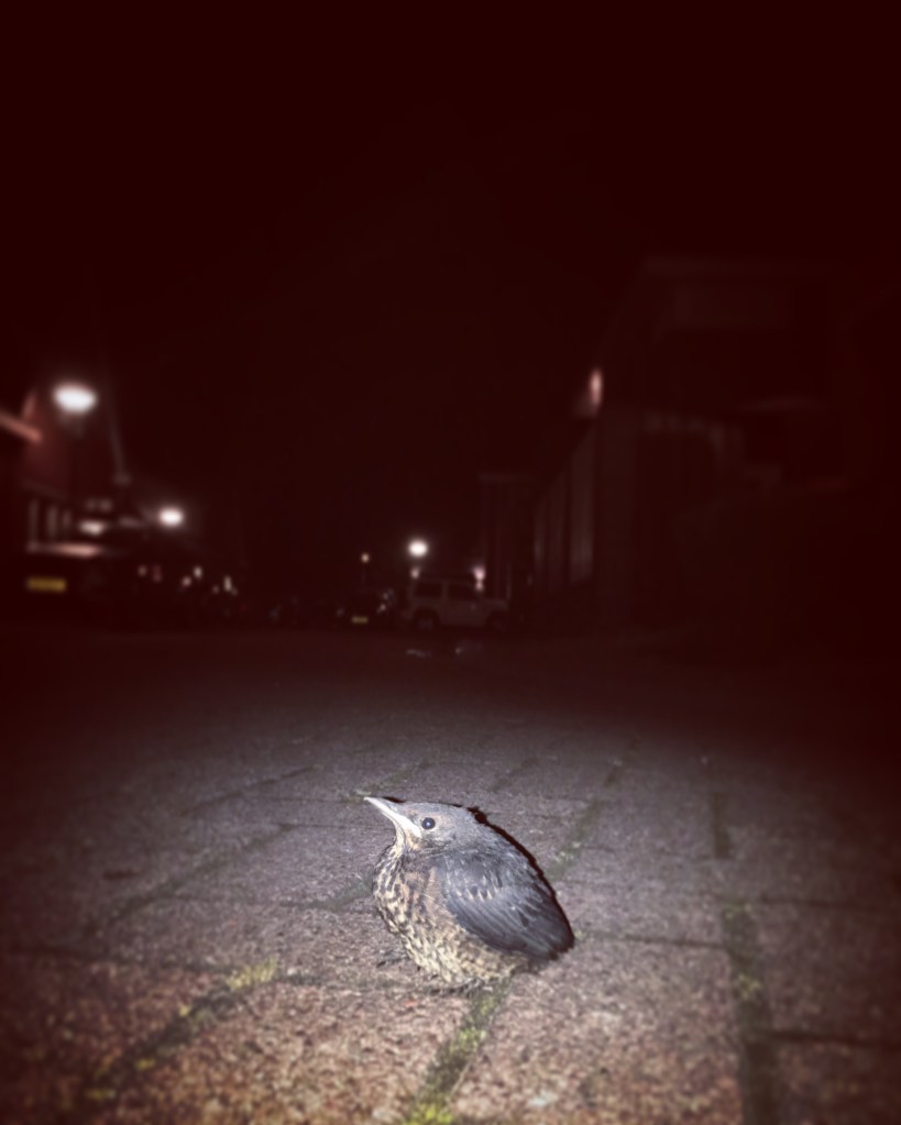 Ga je even je fiets binnenzetten, spot mijn oog een zwart bolletje wol in de verte. Mijn nieuwsgierigheid maakt dat ik er toch even heen trippel en voor je het weet zit je met een vogel te buurten midden in de nacht.